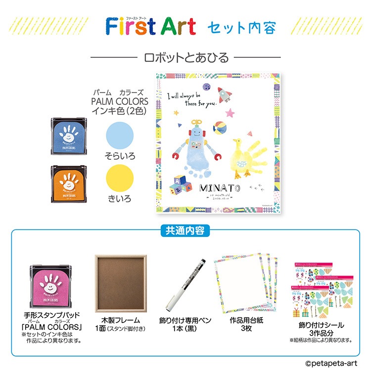カラフルな手形や足形のスタンプをシールやペンで装飾して、世界に一つだけの作品を作る手形アート制作キットです!
